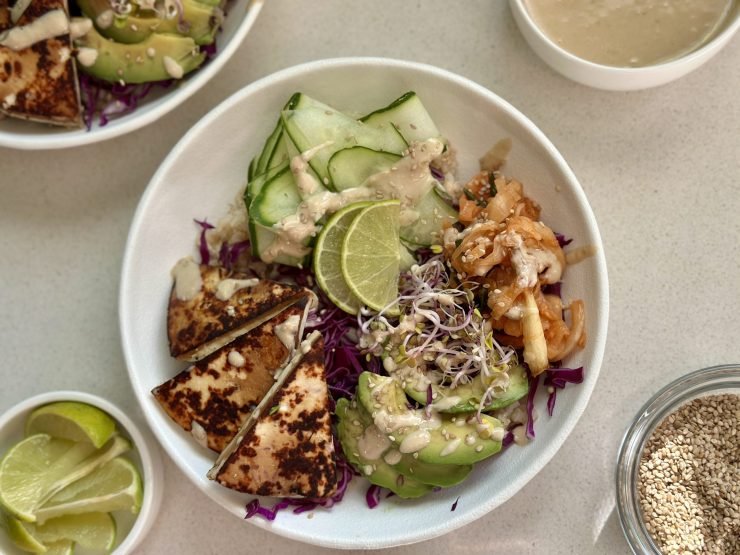 Bowl asiático de tofu y arroz integral: tofu dorado con soja y jengibre, arroz integral o jazmín, sésamo, palta, zanahoria rallada, repollo morado, pepino. Terminás con una salsa de maní, soja, jengibre, ajo, limón y cilantro.