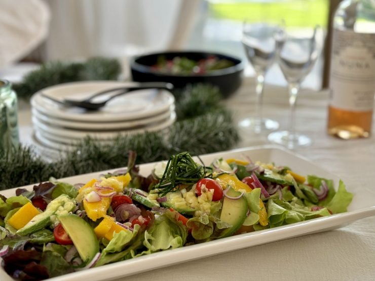 Si no conseguís mango, reemplazalo por duraznos; mantené la vinagreta de piña para aprovechar al máximo frutas de temporada. También podés guardar los tallos y hojas internas de la lechuga para hacer un caldo o un batido verde.