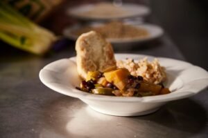 Receta de guiso de batatas y porotos negros con chapati casero. Una propuesta nutritiva, sabrosa y sin desperdicio, que aprovecha restos de vegetales y semillas para volver a la tierra.