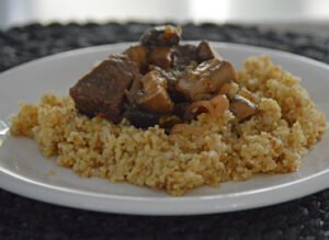 Ensalada de trigo burgol con hongos y rúcula, receta saludable y fácil de preparar.