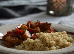 Pollo con pimiento y piña salteado, receta agridulce saludable, fácil y rápida. Ideal para una comida completa con arroz y vegetales.