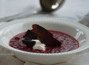 Sopa cremosa de remolachas y chips con sus cáscaras