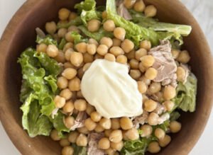Ensalada de garbanzos sin desperdicio: fresca, proteica y lista en minutos. Con pescado, lechuga y mayonesa casera sustentable. Una opción práctica y nutritiva para almuerzos o cenas rápidas.