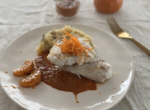 Pescado o tofu con salsa de mandarina y puré cremoso. Receta otoñal, liviana y sabrosa con cítricos, ideal para una comida saludable y equilibrada.