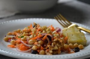 Ensalada de garbanzos, quinoa y tofu: receta fácil, vegana fresca y nutritiva. Con vegetales, nueces y pasas, es ideal como plato principal o vianda saludable. Opción con pollo si no seguis una dieta vegana