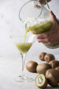 Cóctel de kiwi fresco con o sin alcohol, alto en fibra y antioxidantes, ideal para bebidas refrescantes.