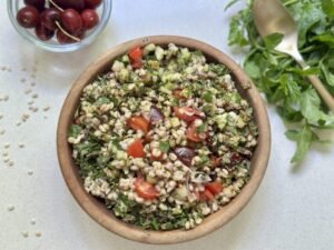 Ensalada de cebada estilo tabbouleh fresca, nutritiva y perfecta para acompañar parrilla o shawarma.