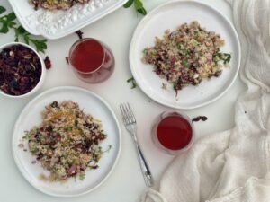 El hibiscus también es ideal para platos salados y puede darle un giro exotico a una ensalada. Esta receta suma a la frescura de las naranjas, la textura suave de la quinoa y el toque ácido del hibiscus. Al hidratar las flores, queda el agua con sabor, color y nutrientes, ideal para aprovechar en una limonada.