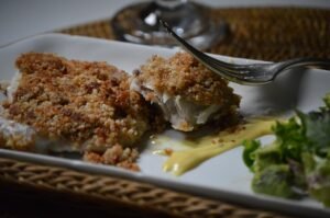 Receta de pescado crujiente con costra de almendras y salsa de limón. Plato fácil y saludable para sorprender, ideal con corvina, abadejo o merluza. Apto pescetarianos.